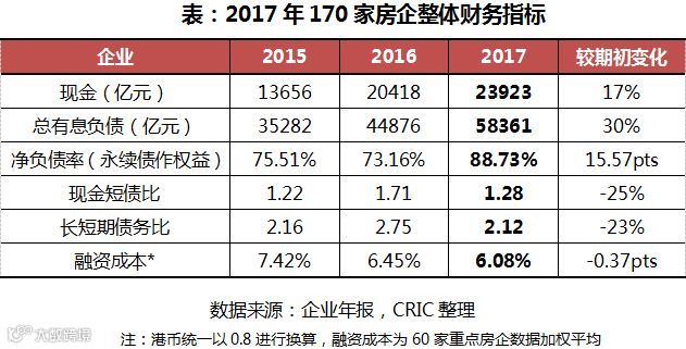 综合来看,2017年房企的偿债压力较2016年末有所增加,但多数企业偿债能力还基本属于稳健水平,主要呈现出以下几个特点:一是杠杆加大,整体净负债率抬升至89%;二是现金短债比和长短期债务比均有了不同程度的“恶化”,总体短期压力仍然不大,部分企业需要警惕;三是品牌房企融资优势突出和公司债的延续效应的影响下,60家重点房企整体平均融资成本继续下降,但是在国内楼市调控和融资收紧的背景下,房企或选择“扬帆出海”,或选择创新类融资方式,融资成本未来或将反弹。