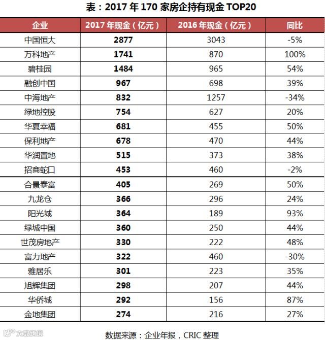 2017年限购、限贷、限售等调控政策的持续加码,房地产融资环境也呈现持续收紧的态势。与此同时,行业集中度持续提高,规模房企销售大涨之下,扩张诉求依然强烈,行业收并购整合加剧,是房企的的现金总持有量的增幅放缓的主要因素。而对于中小企业而言,融资能力相对较弱,在融资环境持续收紧的情况下,所受限制更为明显,使得企业现金增幅放缓甚至出现下滑。
