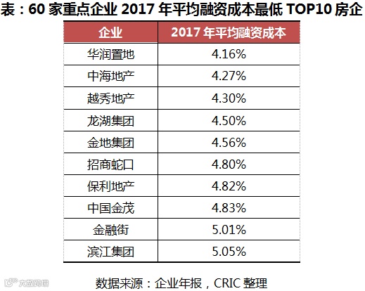 从融资成本来看,2017年60家重点房企融资成本持续降低至6.08%。这一方面是由于重点房企多为大中型规模房企,融资能力相对较强;另一方面也是由于2015、2016年公司债潮的延续效应,多数企业的融资成本暂时处于低位。预计随着境内融资利好不再,房企或转战海外或寻找新的融资渠道,后期融资成本或将出现反弹。