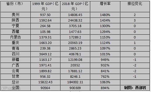 从1999年到2018年,这20年间,西部12省市在GDP方面的表现如下: