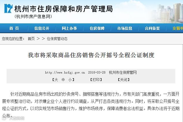 28日晚,杭州住保房管局在其官方网站上发布:“针对近期商品住房市场出现的炒卖房号、捆绑搭售等违规行为,市有关部门高度重视,一方面开展专项整治行动,对涉嫌企业个人进行约谈调查,从严打击各类违规行为。同时,将采取公开摇号全程公证的方式,以切实规范市场销售行为,维护市场秩序,保障消费者合法权益。具体办法将于近期公布。”