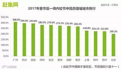 据某招聘网站招聘大数据显示,今年春节后一周的简历量,相比春节期间,涨幅前三的城市分别为成都、西安、武汉。赶集网招聘大数据显示,成都节后一周简历量相较春节期间增幅为366.9%,位居全国首位。而在去年,排名前三的城市是广州、杭州、西安,这意味着越来越多的求职者在就业上开始考虑转向“新一线城市。