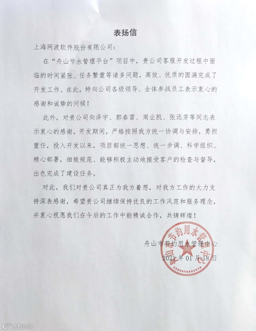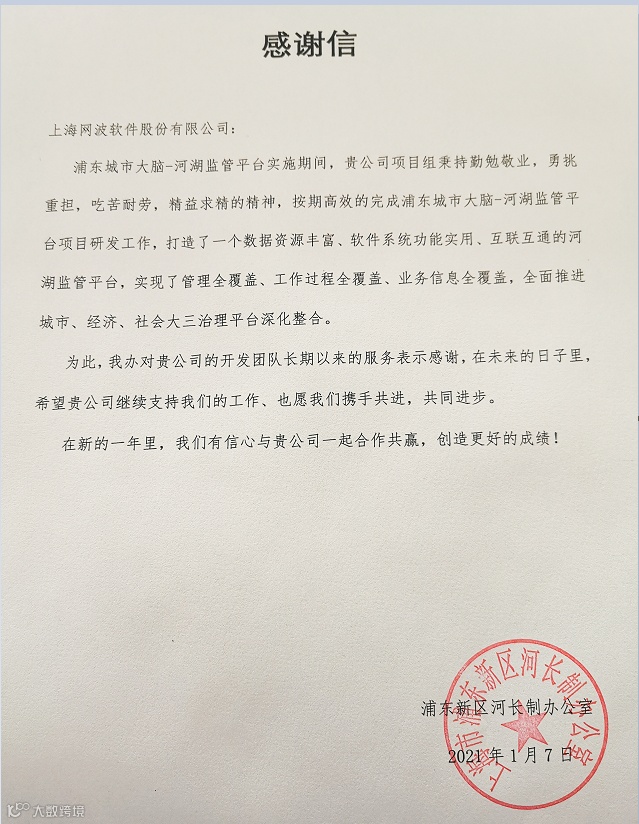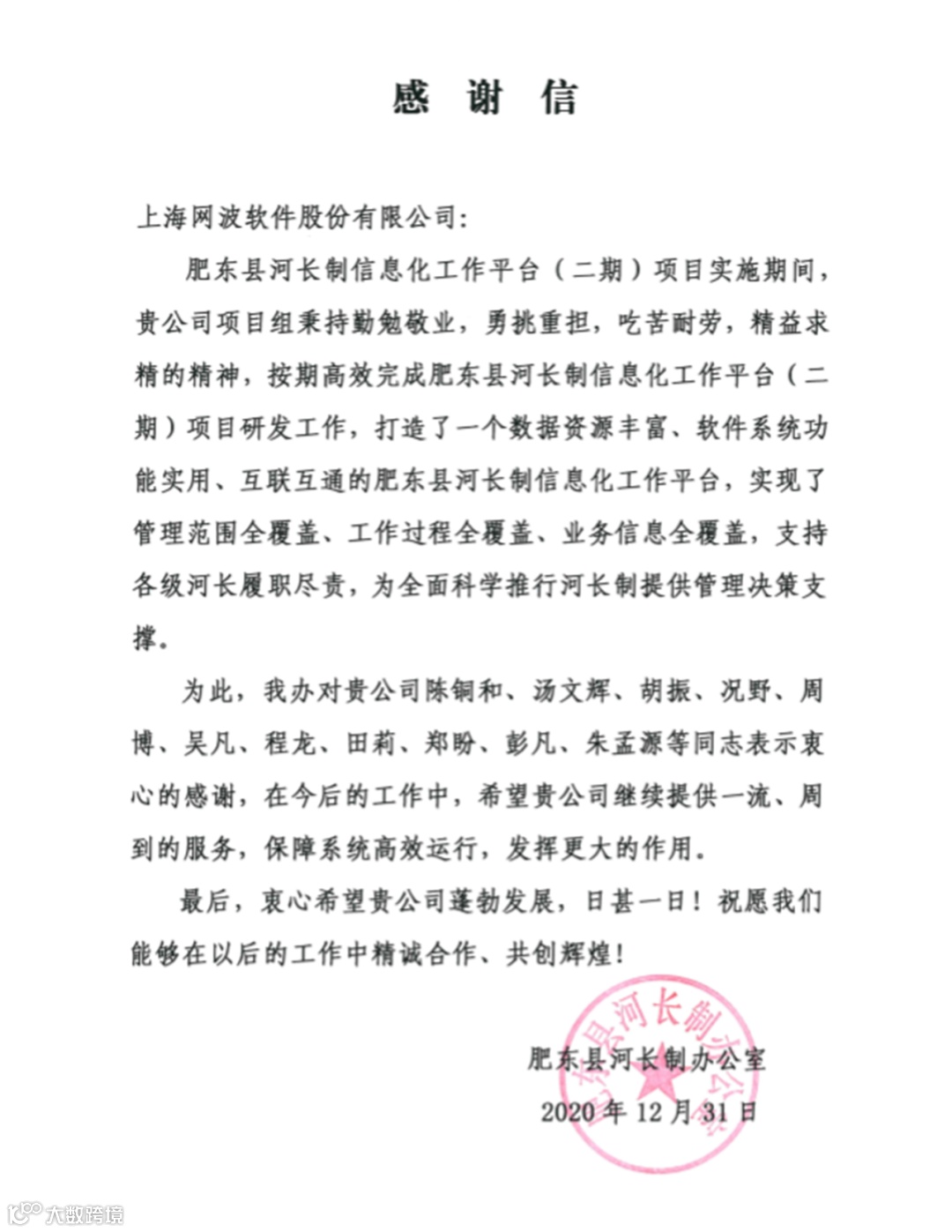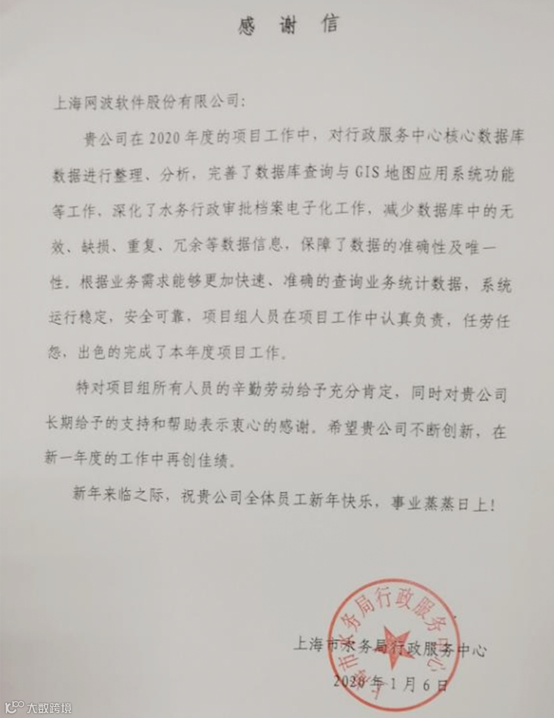 2020年度公司参与了多个水利、水务、海洋等行业单位项目的实施,在实施过程中,项目团队勤勉敬业、吃苦耐劳、细致规范、攻坚克难,认真做好每一个项目的组织工作,高效完成了项目的预期目标,充分体现了实施团队扎实的业务水平、优秀的队伍素质。项目成果受到用户的认可,收到了多封用户的感谢信。持续提升用户满意度是我们不懈努力的目标,2021年我司将一如既往、砥砺奋进,认真做好每一个项目,以“创新驱动”进一步提升项目成果质量和用户满意度。