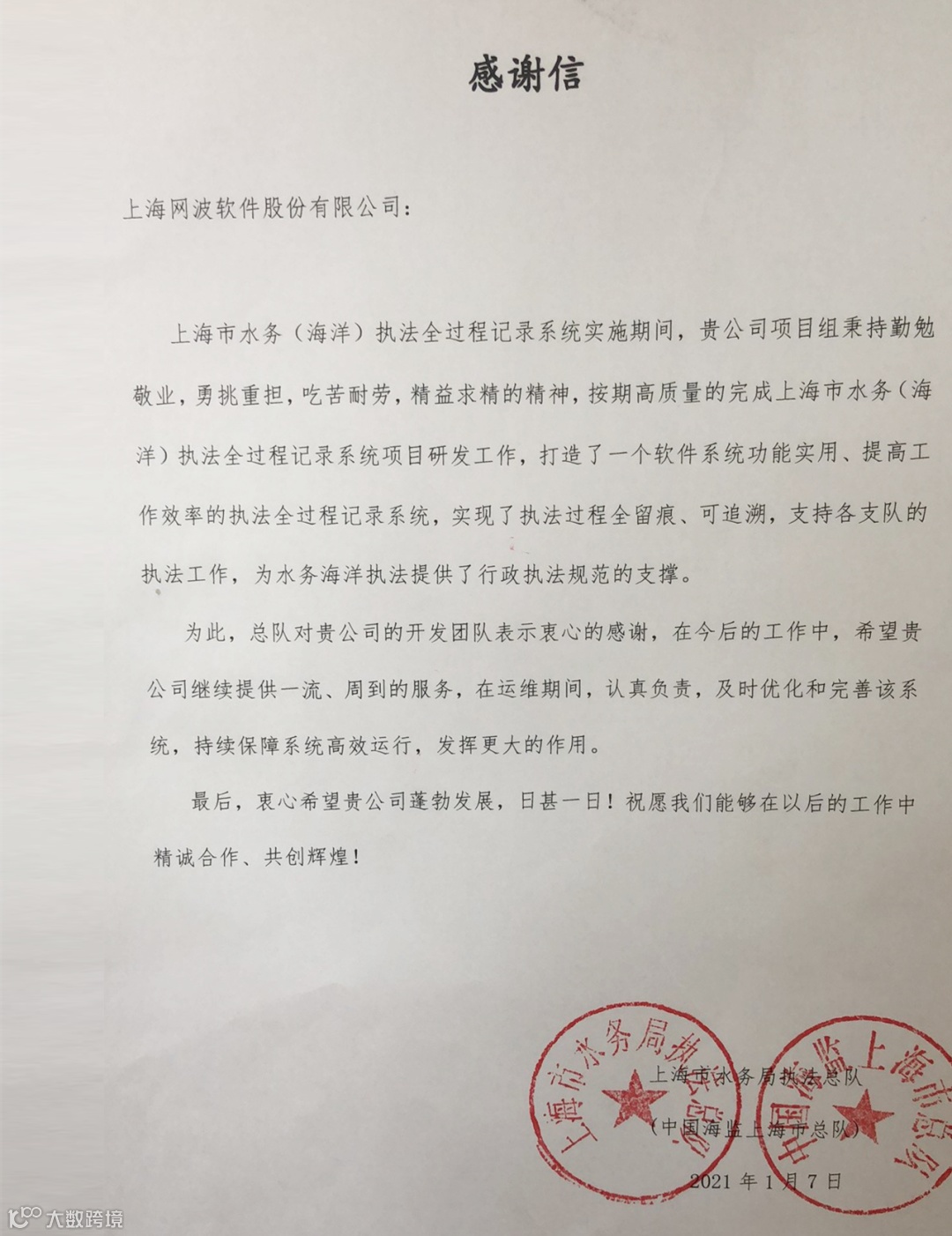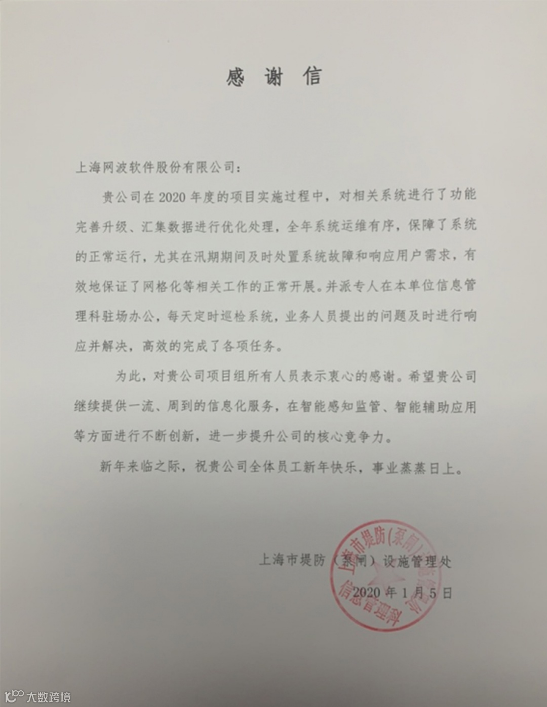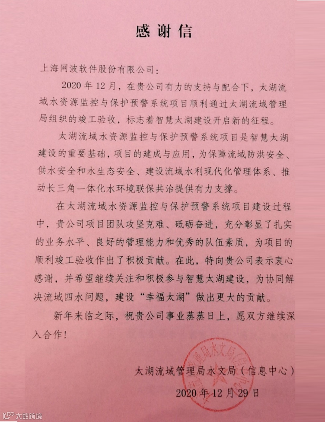 2020年度公司参与了多个水利、水务、海洋等行业单位项目的实施,在实施过程中,项目团队勤勉敬业、吃苦耐劳、细致规范、攻坚克难,认真做好每一个项目的组织工作,高效完成了项目的预期目标,充分体现了实施团队扎实的业务水平、优秀的队伍素质。项目成果受到用户的认可,收到了多封用户的感谢信。持续提升用户满意度是我们不懈努力的目标,2021年我司将一如既往、砥砺奋进,认真做好每一个项目,以“创新驱动”进一步提升项目成果质量和用户满意度。