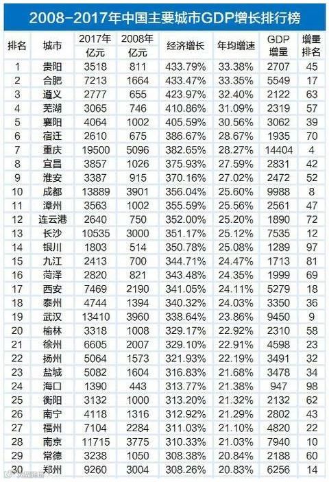 你一定想不到,从2008年到2017年这十年,发展速度最快的是贵阳、合肥;