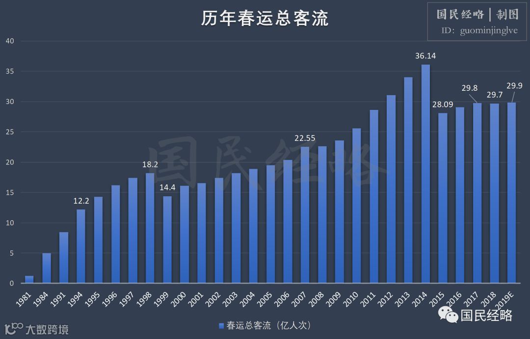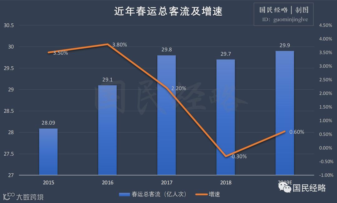 2017年春运总客流29.8亿人次,2018年微降29.7亿人次,2019年预测数据则是29.9亿人次,基本停增。
