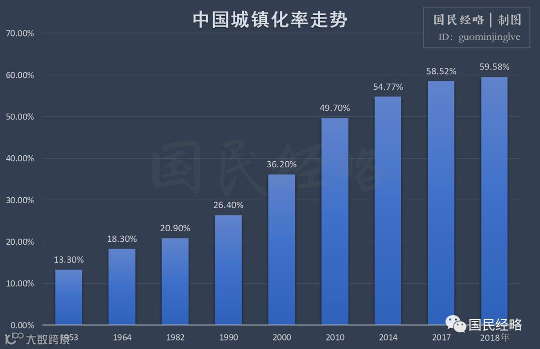 2018年常住人口城镇化率已经高达59.58%。如果将时间拉长到40年,中国城镇化率从1980年代的20%飙升到如今的60%左右,翻了三倍。