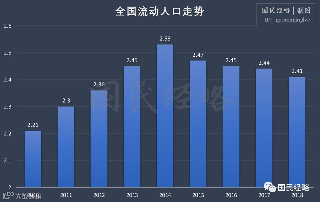 国家统计局数据显示,2014年,我国流动人口达到峰值2.53亿人之后,就开始连续4年下滑,到2018年,流动人口为2.41亿人,相比于四年前减少1200万人。