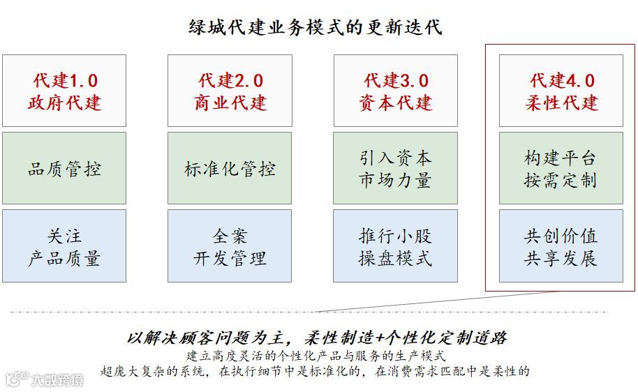 绿城自2010年开展代建以来,这种商业模式飞速发展,代建业务呈现高速增长的趋势。2015年9月,绿城集团全面、全程整合现有资源,成立绿城房地产建设管理集团(简称绿城管理),成为绿城对外实施品牌输出和管理输出的主体,也是绿城轻资产模式从平台化走向集团化发展的里程碑。
