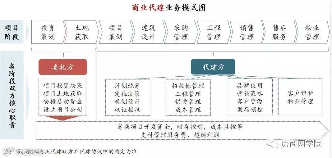 商业代建,是由非政府类委托方委托,代建方进行开发建设或同时负责销售的代建模式。根据目前商业代建的两种主流模式,商业代建模式分为单纯收取服务费的商业代建与股权式代建。