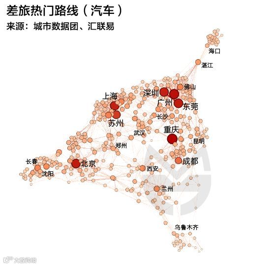 此外,西南地区(成都、重庆、贵州、昆明等)也形成了联系紧密的汽车出行网络。