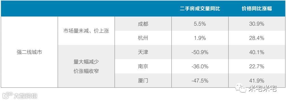 第二类是调控政策严厉,成交量大幅下滑、调控后价格涨幅收窄或下跌的强二线城市,以天津、南京、厦门为代表;