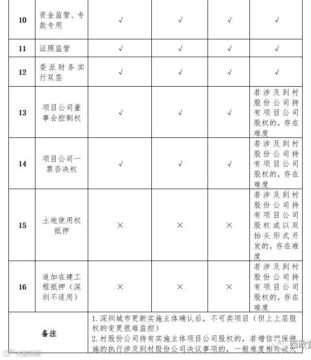根据项目的实际情况,包括但不限于土地/在建工程/房产抵押、股权/应收账款/票据质押、公章证照共管、集团担保、实际控制人担保、差额补足、股权回购、董事及/或财务人员派驻、一票否决等。深圳城市更新项目不同阶段可引入的增信担保措施包括: