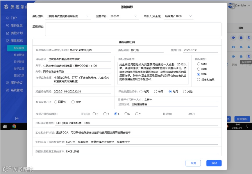 指标监测管理是满足各级行政部门要求监测的关键质控指标和医院管理层关注的核心指标等需求,并可对指标数据(病历)进行质控,下发任务并落实改进,主要包含院级指标、部门级指标和科室级指标。设置指标池管理,将常态化监管指标纳入指标池,设置指标监测工具,一次设置,永久有效;通过可视化图形展示,总览全院或科室数据,掌握监测指标落实情况。
