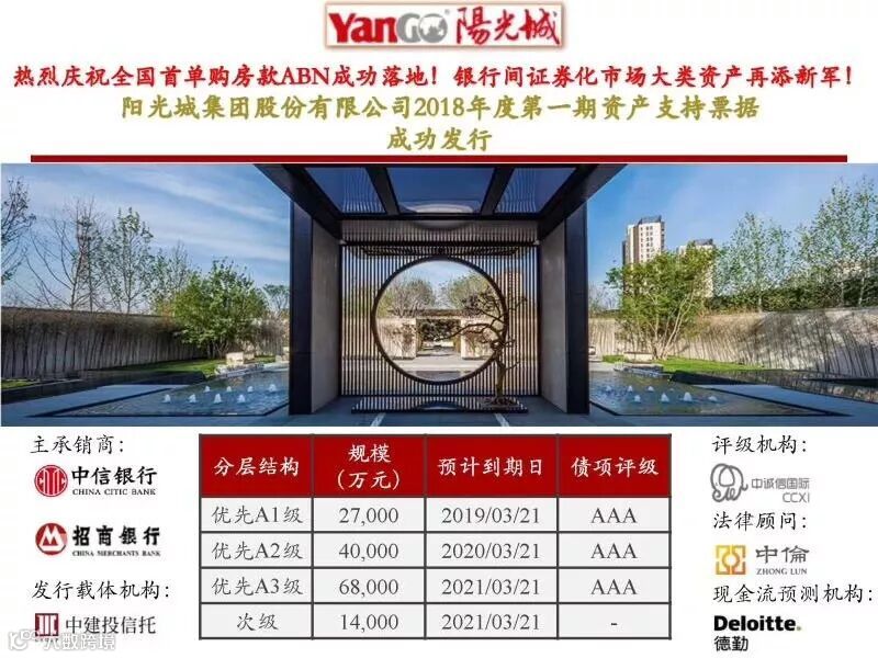 3月20日,由中建投信托担任发行载体管理机构的“阳光城集团股份有限公司2018年第一期资产支持票据”于银行间市场成功落地,总规模14.9亿元。该产品是银行间市场交易商协会首单以购房应收款作为基础资产的ABN项目,得到了交易商协会的大力支持。