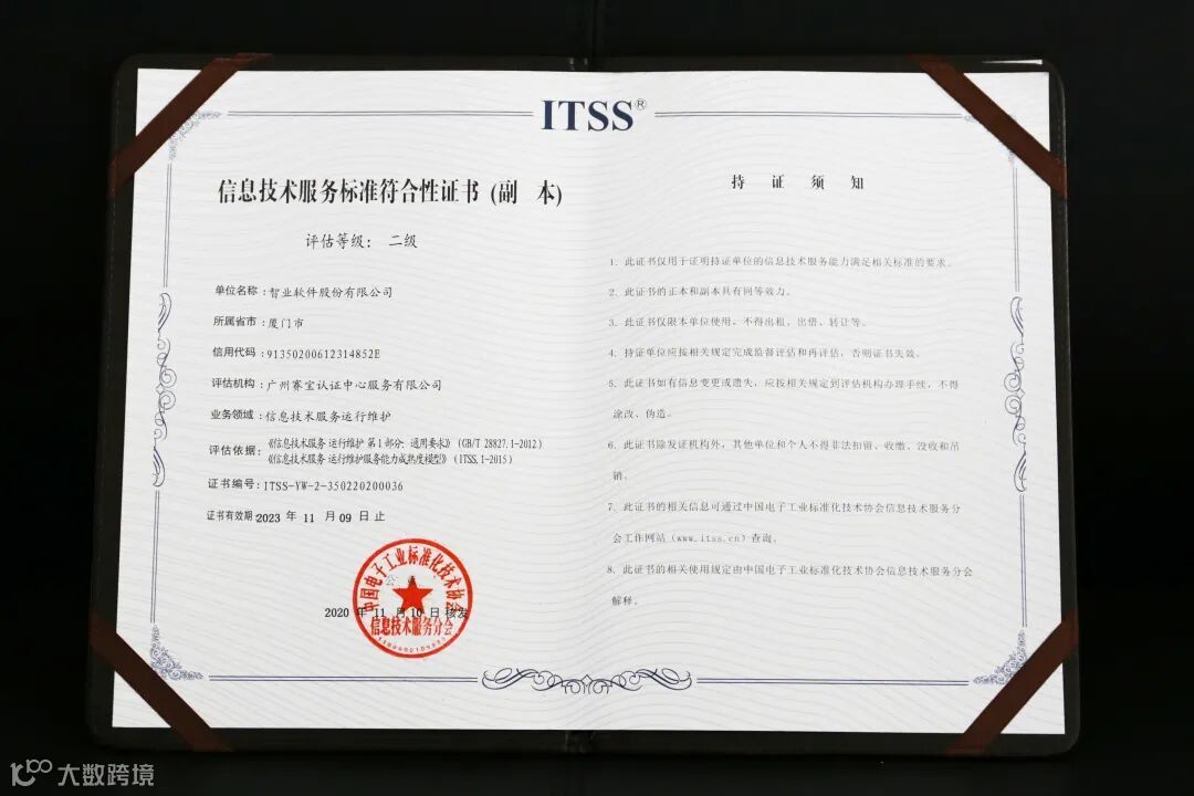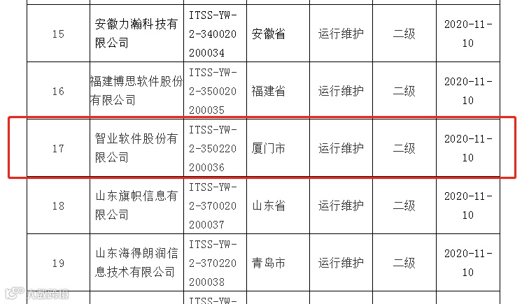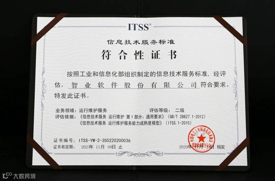 近日,中国电子工业标准化技术协会信息技术服务分会正式公告《通过信息技术服务标准符合性评估的单位名单》,智业软件顺利入选,被授予ITSS运行维护服务能力成熟度二级证书,成为本次唯一一家通过ITSS二级评估的厦门市企业,公司信息技术服务水平获得国家权威机构的认证。