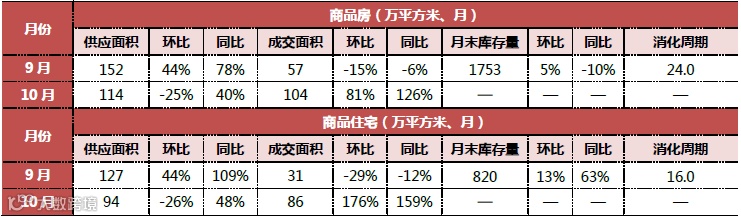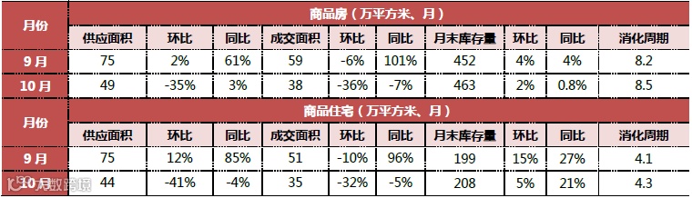 10月,苏州商品住宅供求环比齐跌,库存上升消化周期拉长0.5个月。本月推盘以中高端改善项目为主,整体去化呈下降趋势,平均去化率约五成。土地市场挂牌数量下滑,仅吴江2宗宅地再挂牌,成交6宗地,多被国企底价或低溢价收入囊中,另有2块地流拍。