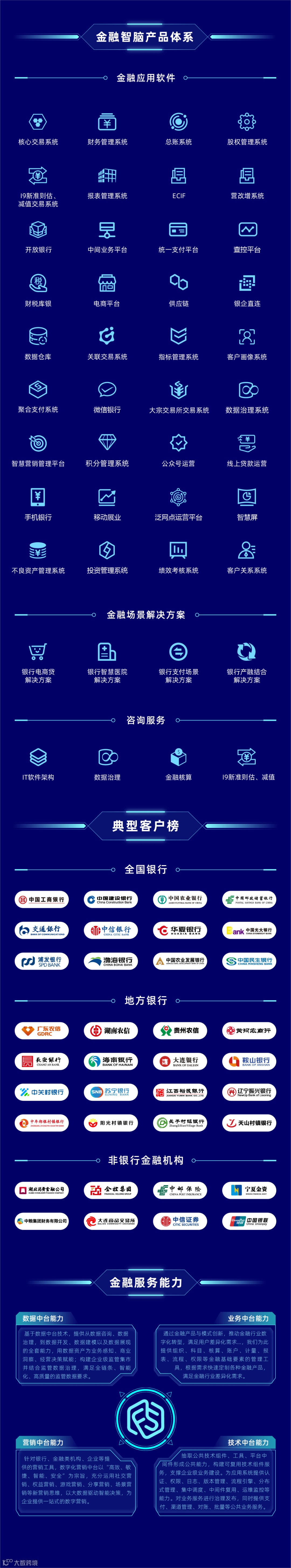 东华软件金融事业部主要负责金融解决方案和产品的研发、客户项目的开发、银行和合作伙伴的软件开发服务、金融业务咨询等业务,金融事业部拥有大批深谙金融业务的行业专家和IT专家、稳固的客户根基和丰富的行业知识,并拥有完全自主知识产品的银行整体解决方案。