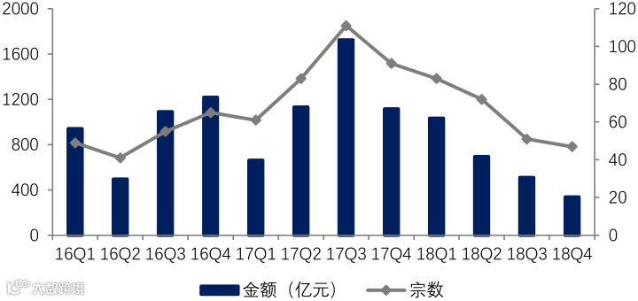 土地和资金是房企的“粮草”和“钱袋”,2018年土地市场降温和融资收紧是房企收并购减少的重要原因。“粮草”方面,近十年房企收并购金额和土地成交楼面均价呈现出同步波动趋势,表明土地市场热度和土地价格对企业选择拿地方式影响甚大,由于2018年土地市场有所降温,房企通过收并购降低土储成本的动力相对削弱。“钱袋”方面,2018年以来,房企的融资环境进一步收紧,特别是针对用于房地产开发土地并购或房地产开发土地项目公司股权并购的贷款加强合规监管,一系列融资监管政策限制了收并购金额的规模增长。