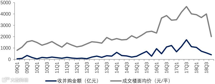 图:2009年-2018年重点房企收并购金额与同期全国300城成交楼面均价