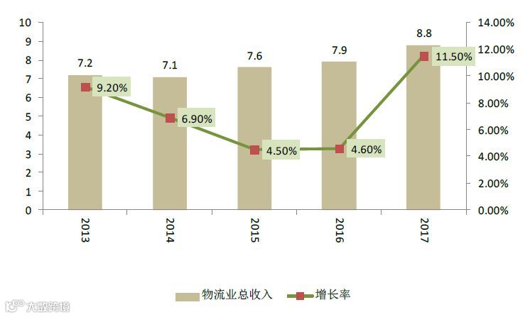 随着我国运输、仓储业和邮政业的固定资产投资的增大,以及经济的发展和电商的崛起,中国的物流业务总收入也呈较快速度增长。2013年物流业总收入为7.2万亿元,至2017年为8.8万亿元,2017年同比增长11.50%。物流业收入的增长,也侧面反映物流地产商的物流园区租金收入有较快增长。