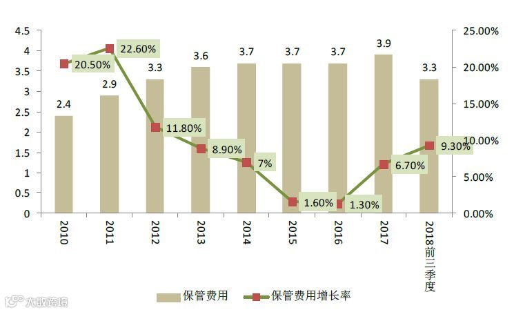 图:2010-2018前三季度中国社会物流保管费用及增长率