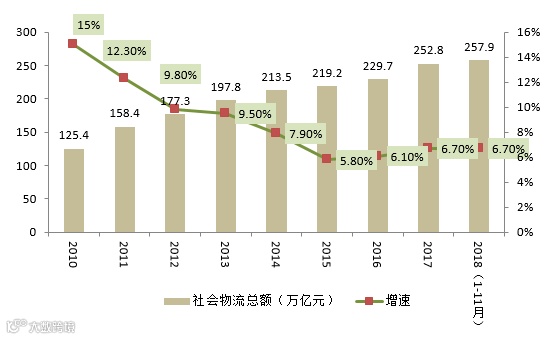 我国的社会物流业总额逐年不断扩大,从2010年的125.4万亿元增长至2017年的252.8万亿元;进入2018年(1-11月),社会物流总额为257.9万亿元,同比增长6.7%,可以看出增速保持较为稳定。虽然近年来社会物流业总需求增速如下图呈放缓趋势,但在中国经济保持中高速发展的前提下仍然会保持稳定增长。
