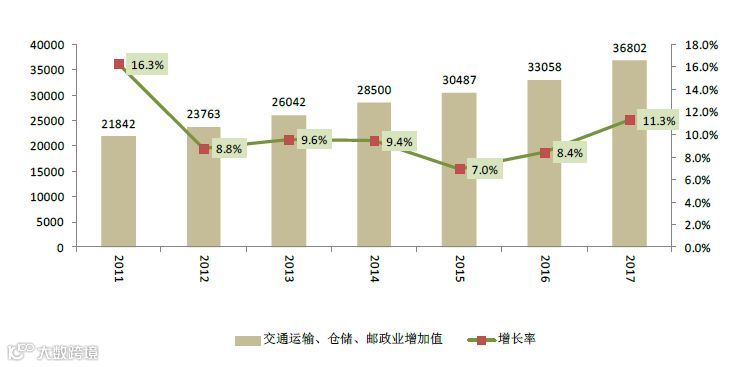 图:2011-2017中国交通运输、仓储、邮政业增加值及增长率