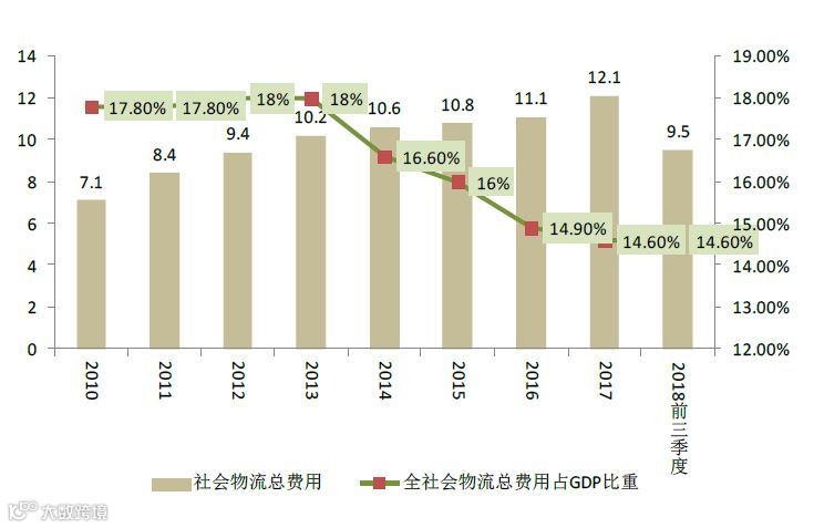 图:2010-2018前三季度中国社会物流总费用及占GDP比重