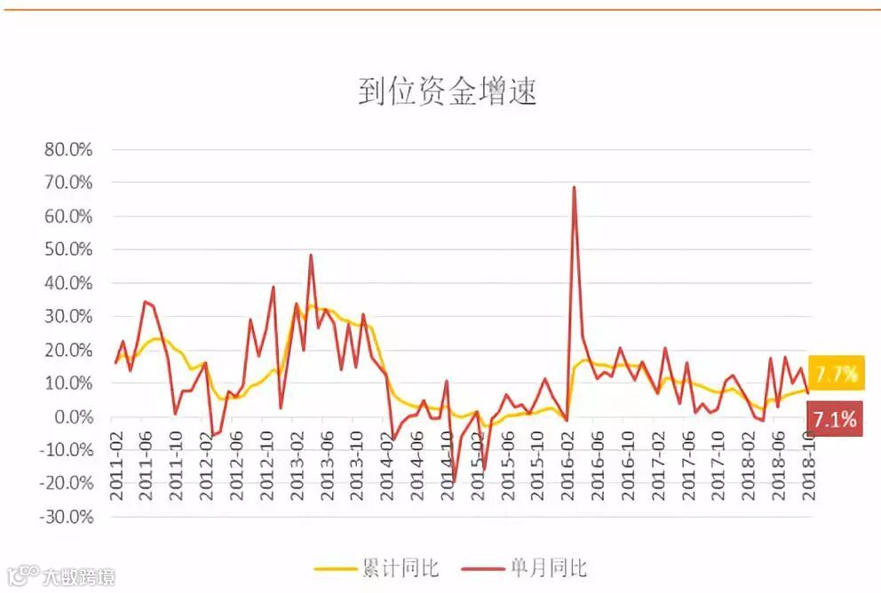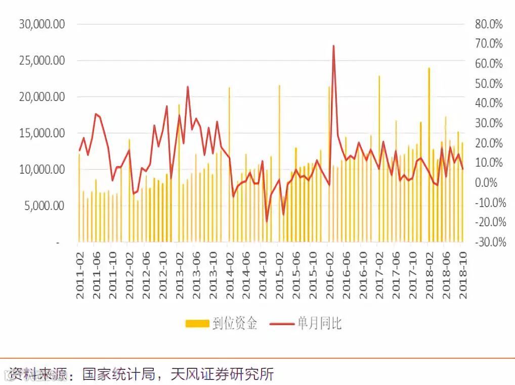 单月值同比增速下滑更为明显,10月单月房地产开发企业到位资金13754亿元,同比增长7.1%,增速较9月下降7.3个百分点。从到位资金的构成来看,除个人按揭贷款外,到位资金的各主要构成项目同比增速均下滑。其中国内贷款1686亿元,自筹资金4916亿元,定金及预收款4683亿元,个人按揭贷款1886亿元,分别同比增长-6.1%、6.1%、16.4%、2.1%,增速较9月分别提高-13.7、-6.4、-9.4、5.0个百分点。如果我们将“定金及预收款”和“个人按揭贷款”两项加总作为“销售回款”的测度指标,我们发现10月份销售回款6569亿元,同比增长11.9%,增速较9月份回落4.1个百分点。