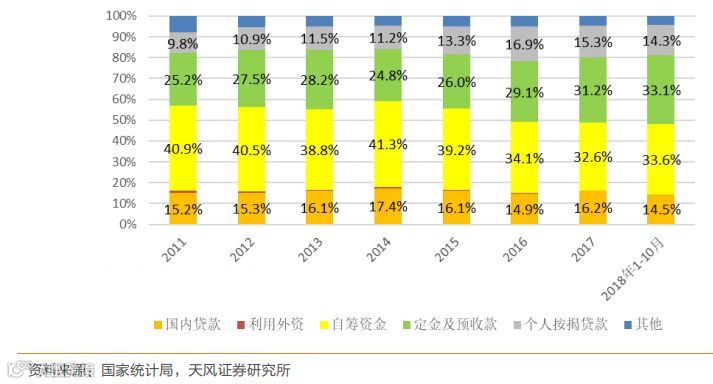 房地产企业到位资金同比增速结束连续三个月回升态势,重新开始下滑。2018年1-10月,房地产开发企业到位资金135636亿元,同比增长7.7%,增速较1-9月下降0.1个百分点;从到位资金的构成来看,除个人按揭贷款外,到位资金的各主要构成项目同比增速均下滑或持平。其中国内贷款19727亿元,自筹资金45512亿元,定金及预收款44942亿元,个人按揭贷款19408亿元,分别同比增长-5.2%、10.8%、16.3%、-0.9%,增速较1-9月分别提高-0.1、-0.6、0.0、0.3个百分点。