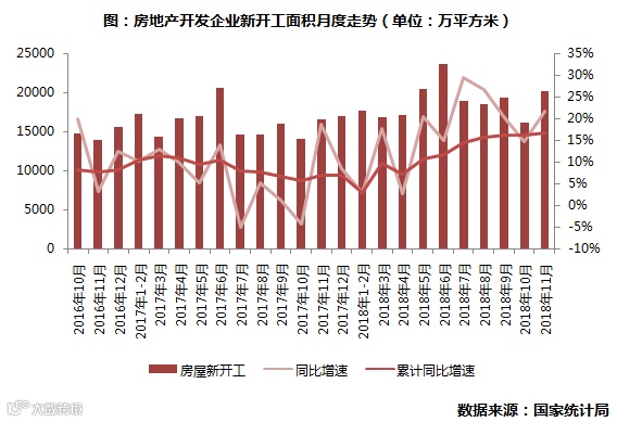2018年新开工面积累计增速持续上行,1-11月房屋新开工面积累计同比增速一直保持着持续攀升的态势,本月达到了16.8%,为近两年来新高。而从单11月来看,新开工面积也突破了2万平方米,同比增长了21.68%,环比增长了24.55%。
