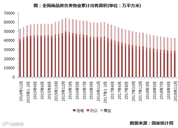 2018年“去库存”取得了初步成效:11月末,商品房待售面积52627万平方米,比10月末减少162万平方米,降幅虽有收窄但整体库存量仍处于下降通道。其中住宅待售面积约2.55亿平方米,较年初下降了4636万平方米,去库存效果显著;对比之下,商业和办公物业的库存量虽有不同程度下降,但基于存量基数大且销售困难,未来多渠道去库存的道路依旧漫长。