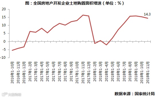 从月度走势来看,年初土地购置面积同比增速一直在正负低位波动,5-8月保持着稳步增长的态势,且增幅持续扩大,而后在整体楼市转冷的背景下,土地市场也收到了部分影响,房企拿地热情逐步减弱,2018年1-11月土地购置面积增速降小幅微降至14.3%。