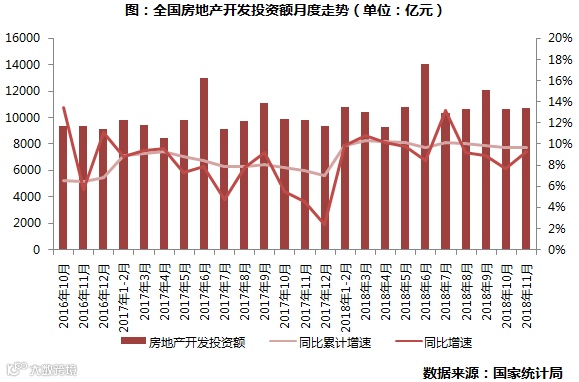 步入2018年以来,房地产开发投资额基本都处于企稳回升状态,11月,全国房地产开发投资额为10758亿元,与10月大体持平,环比微增0.92%,同比上升9.3%;从1-11月整体来看,开发投资额累计增速为9.7%依旧高位运行,与1-10月份持平。房企还是保持了较高的开发投资热情,主要是受新开工增速和土地购置面积上涨所致。一方面多数房企都在加紧工期,以求现金的快速回笼;另一方面房企拿地积极性恢复,5月土地购置面积增速由负转正以来一直持续上扬,近期才有了小幅微降的趋势,也带动了开发投资额稳步增长。