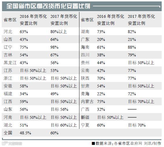 据中国房地产报记者查阅,当前东北、西北和西南省份对棚改货币化依赖度较大。官方数据显示,2017年末大多数省市棚改货币化安置比例升至50%以上。如:吉林、黑龙江、安徽均超55%,青海72%,陕西77%,湖南83%,海南89%,辽宁97%。部分地区还将货币化安置比例提高至100%,原则上不再新建棚改安置房,如江苏22个县、宁夏回族自治区部分市县区等。