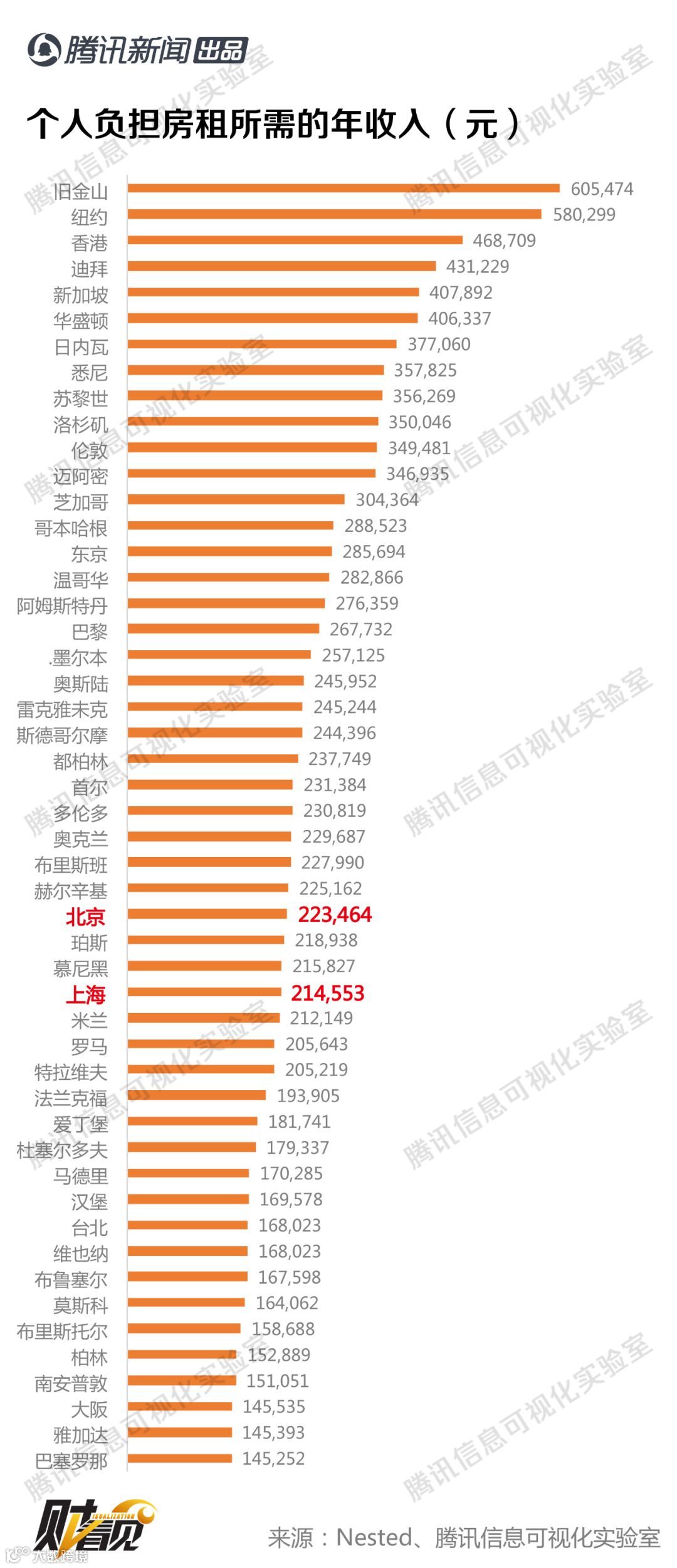 调查显示,在租房成本最高的旧金山,一个人至少年薪要达到60万人民币,才能拥有舒适的居住空间;上海和北京的上班族也同样压力山大,在北京,一个人至少要赚够22.3万,才能租得起39平方米的房子;在上海,年薪则至少21.4万。