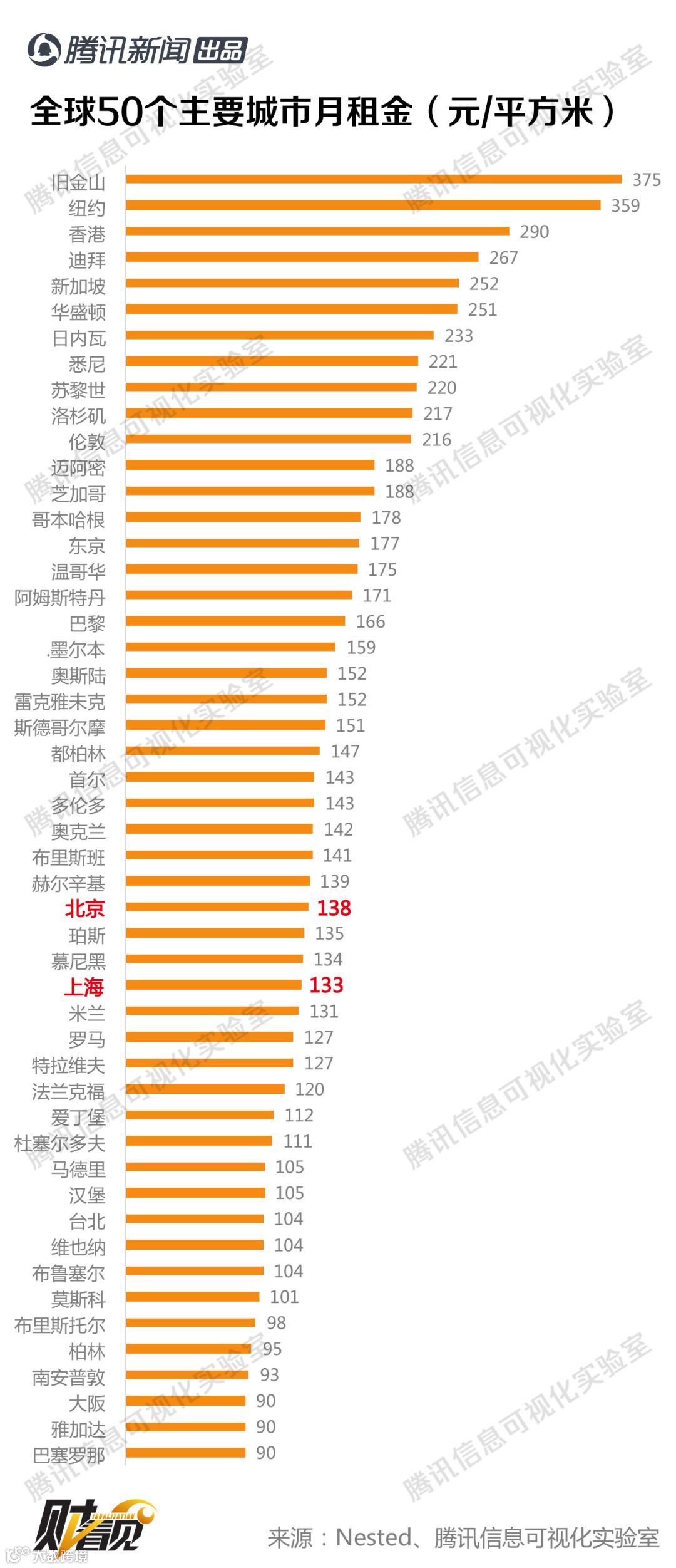 下图为全球50个主要城市房租排名情况。美国东西海岸两大城市纽约和旧金山分别位居第二、第一位,在这两个地方,每个月租1平米的房子,要花费超过350元人民币。
