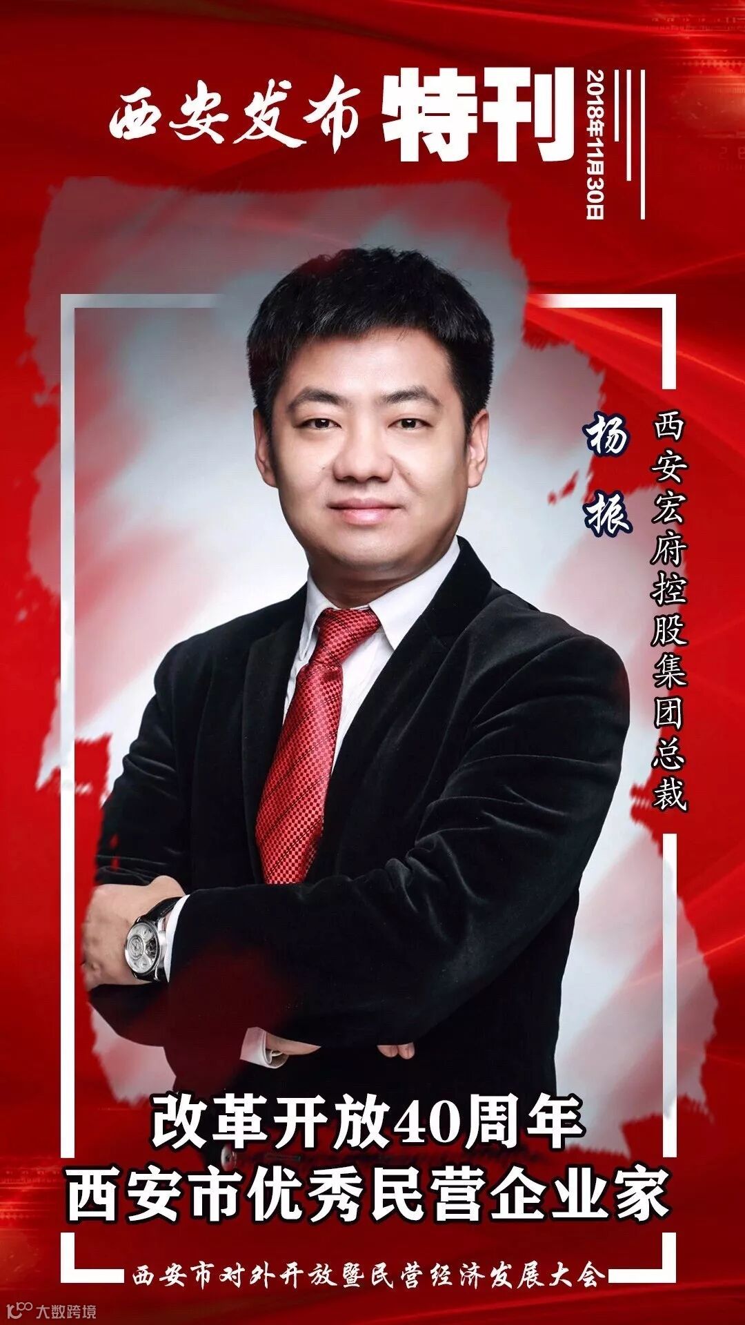 2018年11月30日下午,西安市对外开放暨民营经济发展大会在曲江宾馆第一国际会议厅隆重召开。大会表彰了60家优秀企业与50位优秀民营企业家以及20位优秀创业明星。西安宏府集团总裁杨振出席此次大会,被评为改革开发40周年“优秀民营企业家”。