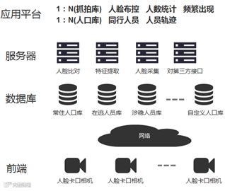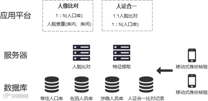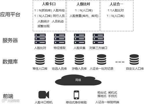 系统需配合前端人证合一终端和人脸采集相机使用,主要功能包含:1:1比对、1:N比对、人脸布控、同行人员分析、人员轨迹、频繁出现、人脸查重、人数统计等。