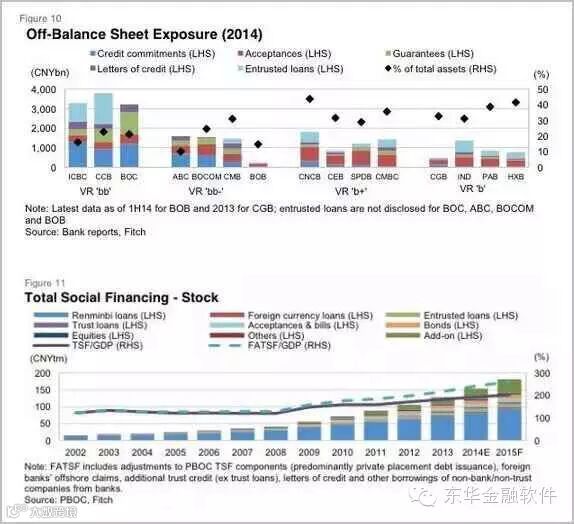 诸如信托贷款、委托贷款、承兑汇票和票据之类的表外融资占官方2014年末社会总融资的18%,较十年前的不到2%大幅增长。在加权平均基础上,部分银行的表外融资敞口相当于国有商业银行总资产的15%,中型商业银行总资产的25%。如果计入委托贷款,这类融资的比例还会更高,尽管这一信息并非所有银行都会披露。