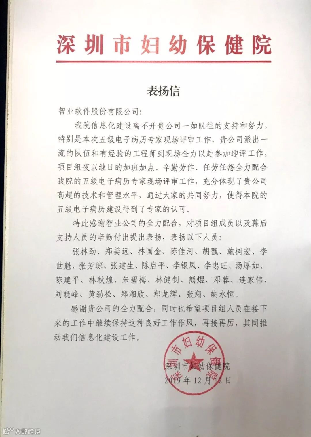 深圳市妇幼保健院发来表扬信!