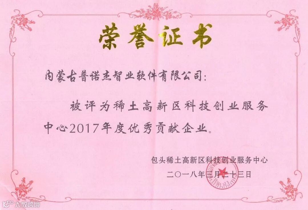在近期召开的包头市稀土高新区科技创业服务中心(国家级)2018年工作会议上,内蒙古普诺杰智业软件有限公司(以下简称普诺杰智业)获评2017年度“优秀产业化企业”、“优秀贡献企业”,并获评2018年度高新区享受“绿色通道”的重点企业及企业家。