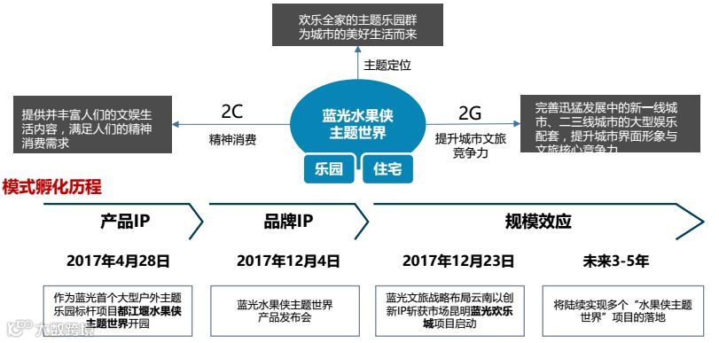 代表案例:蓝光水果侠乐园。蓝光水果侠乐园以自有 IP「水果侠」乐园为核心竞争力,通过捆绑住宅用地,获取土地规模化的扩张。