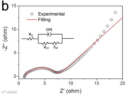 作者测试了电化学阻抗谱(EIS)以分析K-FeHCF的电荷转移过程(图2)。通过基于相关等效电路对EIS曲线进行拟合后,得到1.0欧姆的等效串联电阻和6.4欧姆的电荷转移电阻(Rct)。较低的Rct值表明电荷转移过程迅速,与优异的倍率性能一致。