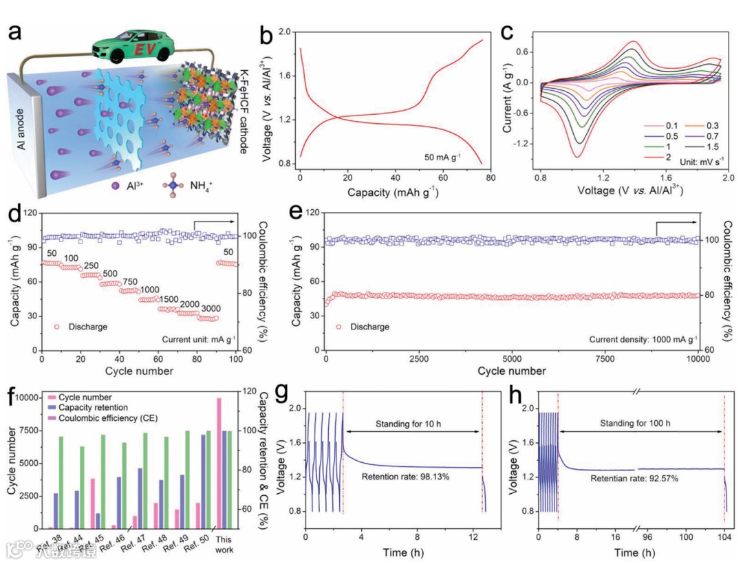 a) Al//K-Fe HCF AAHB的示意图。b) 50 mA g-1电流密度下的充放电曲线。c) 不同扫描速率下的CV曲线。d) 不同电流密度下的倍率性能。e) 1000 mA g-1电流密度下的长期循环稳定性。f) Al//K-Fe HCF AAHB与最近报道的水系铝金属电池和Zn//PBA电池的性能比较。g,h) 10和100 h的静置实验。