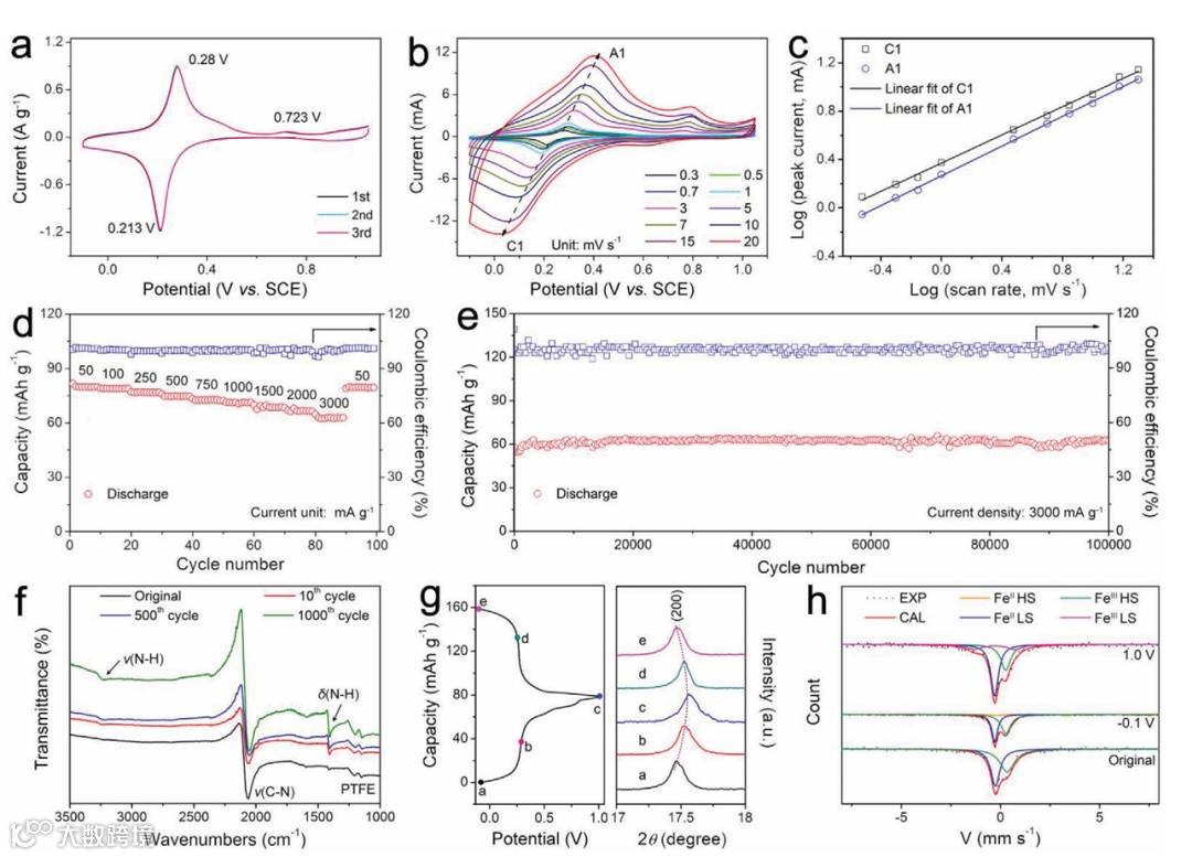a) 0.3mVs-1下的前三次CV曲线。b) 不同扫速下的CV曲线。c) A1和C1峰的Log (峰电流)对Log (扫速)曲线。d) 倍率性能。e) 3Ag-1下的长期循环性能。f) 循环前后K-FeHCF电极的FTIR光谱。g) K-FeHCF电极在选定电压下的典型恒电流充电/放电曲线和相应的非原位XRD图谱。h) K-FeHCF电极在充电和放电状态下的非原位57Fe穆斯堡尔谱。