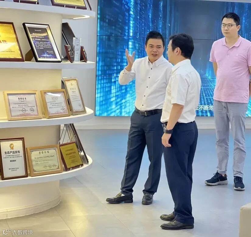 在蒙圣光的带领下,韩栋一行参观了公司展厅,了解东华发思特多年来取得的企业资质荣誉、产学研合作、知识产权以及智慧城市、乡村振兴成功案例。