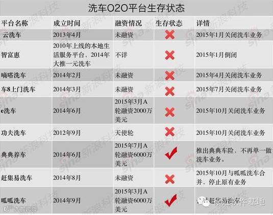 去年,国内一共有九家提供O2O洗车服务的初创公司,但现在,只有两家活了下来(见下图)。