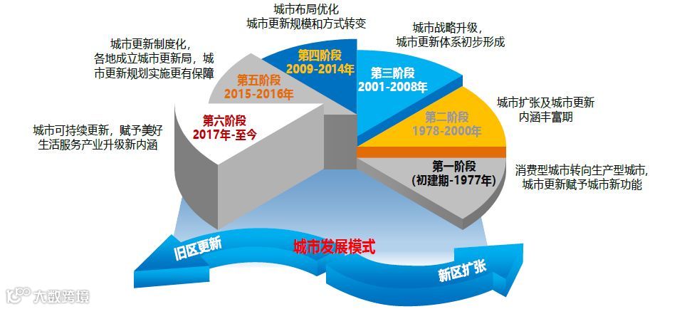 城市更新的发展总体经历了六个阶段,从初创期消费型城市,到赋予生产、生活、生态三生及美好生活内涵的可持续高质量发展城市。